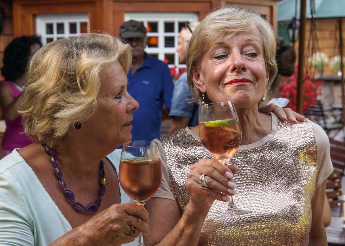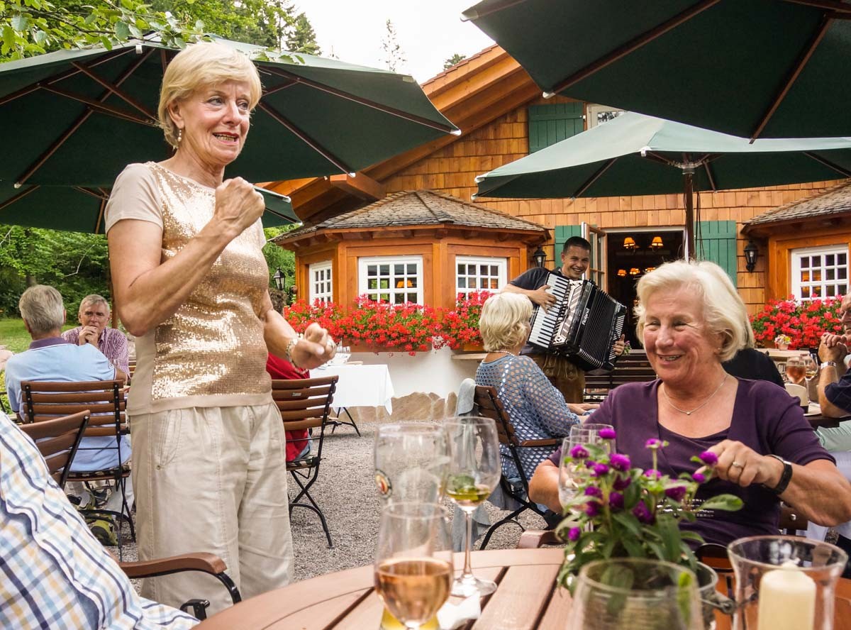 Ziel: die vom Hotel Bareiss bewirtete Wanderhütte "Sattelei". 'Hütte' klingt schlicht, die Realität ist nobel. Eben Bareiss. Empfang mit Sekt, Sommerschorle, Musik und Elsässer Flammkuchen. Der Durst ist groß. Denn mit über 30 Grad herrscht bestes Kaiserwetter.